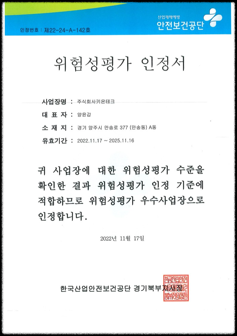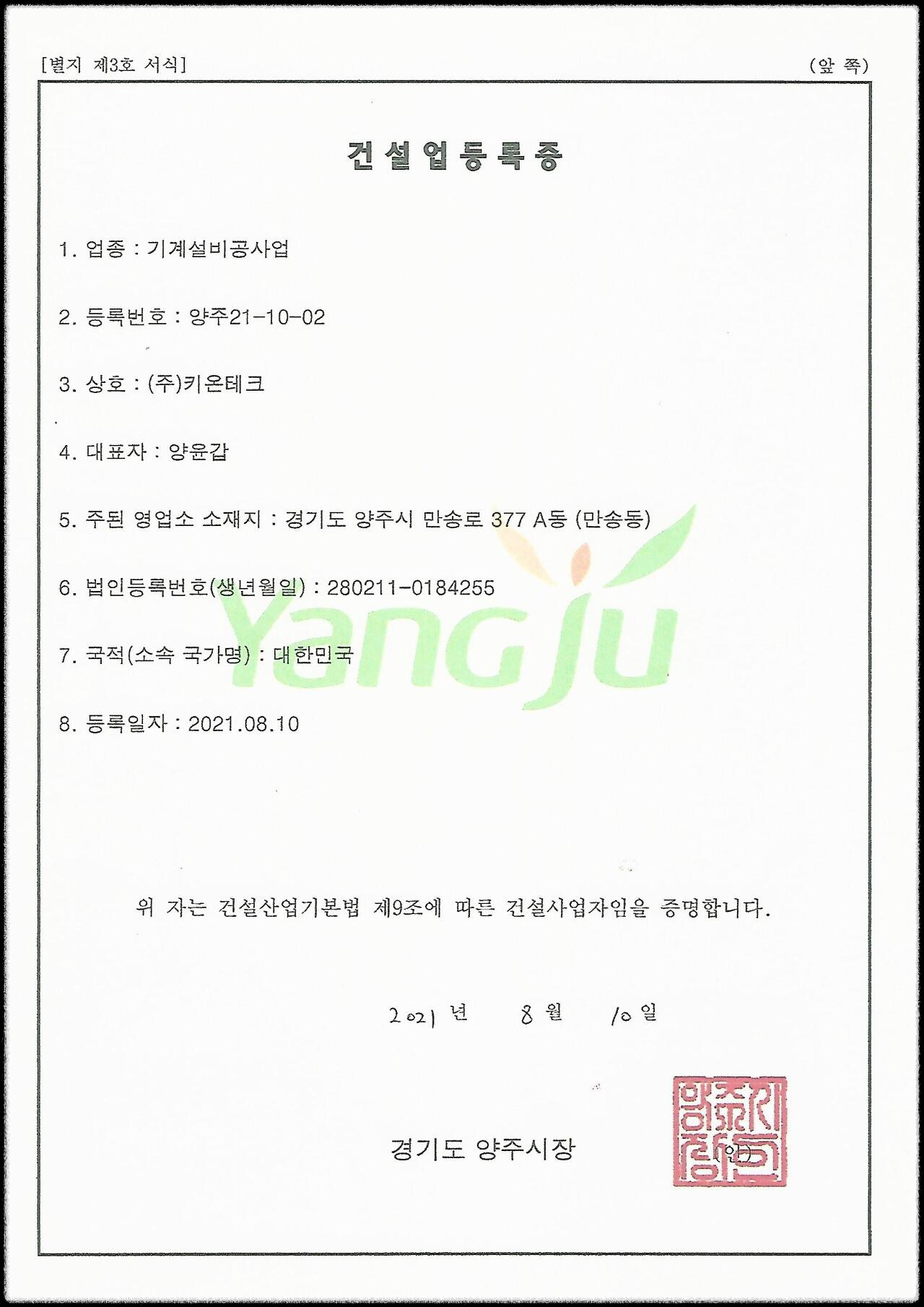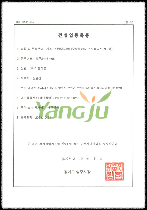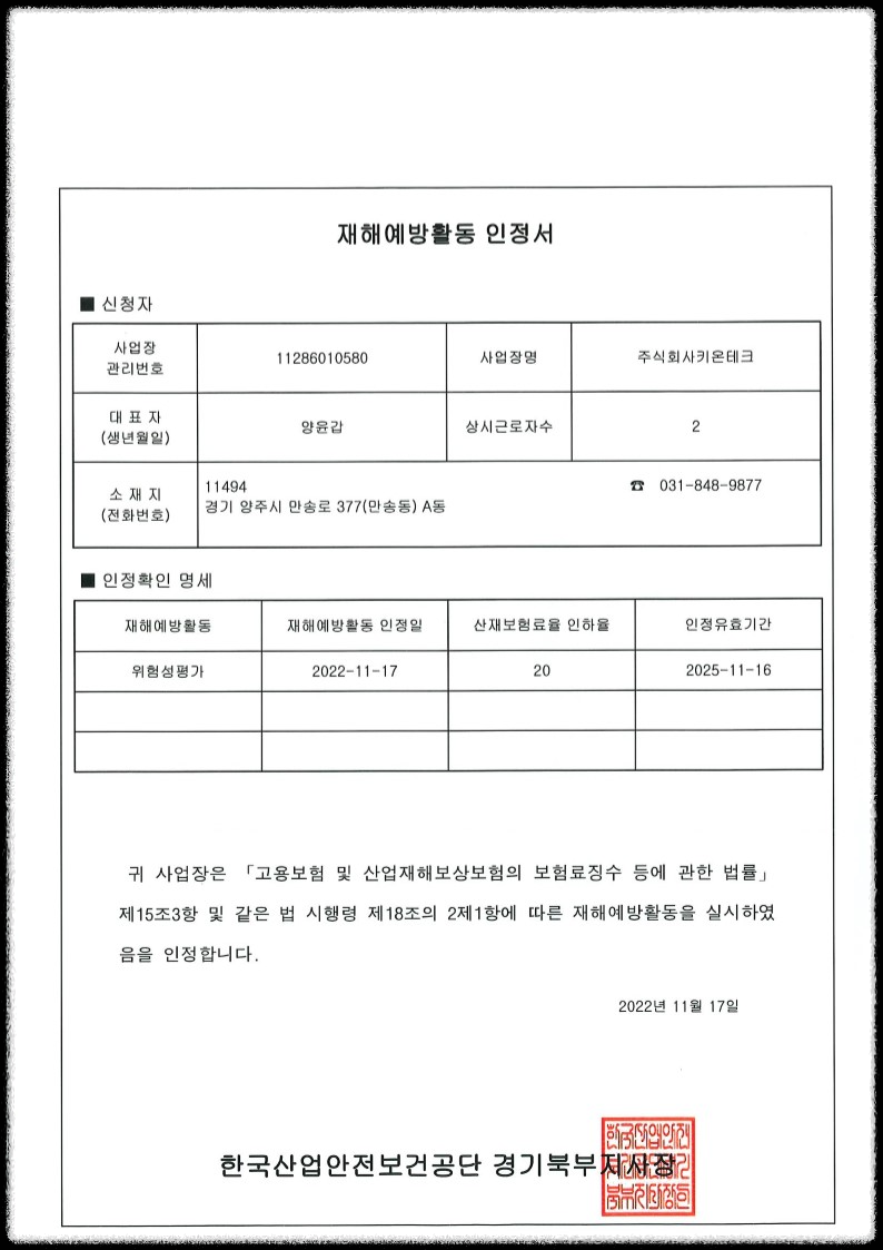 건설업 등록증 및 한국산업안전보건공단 인정서