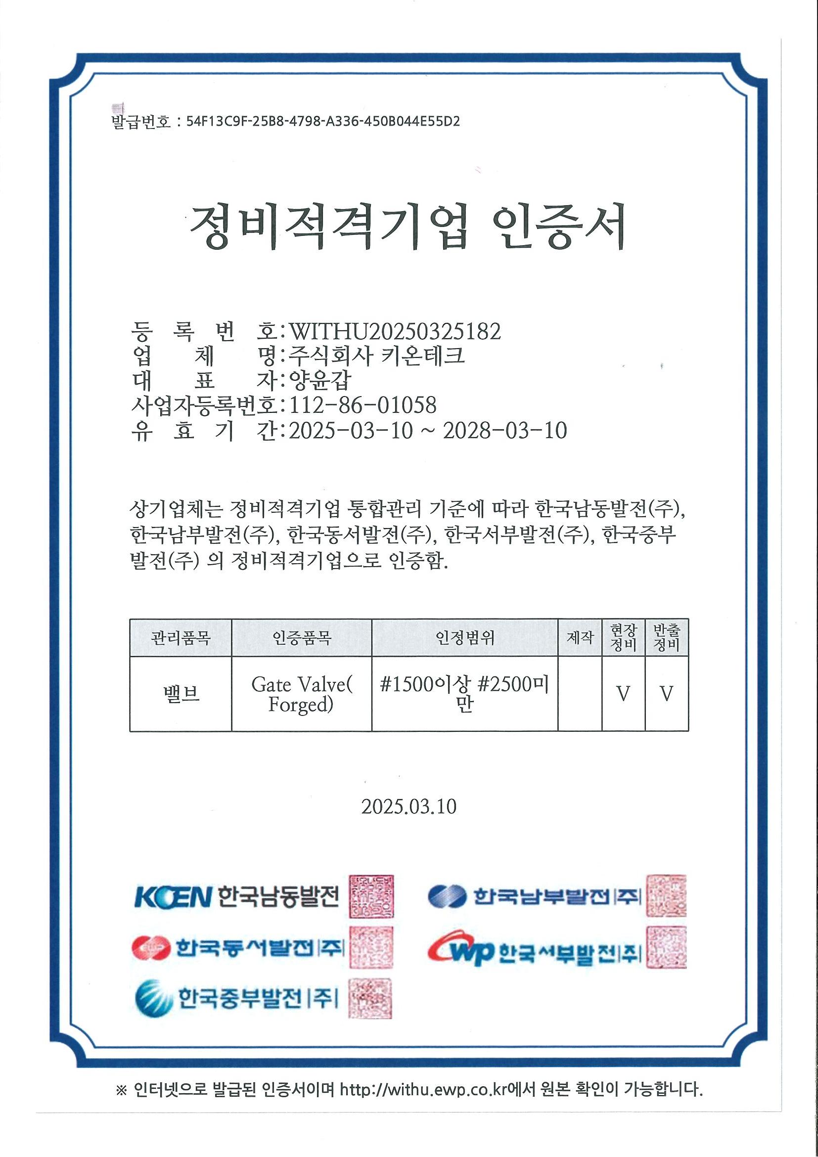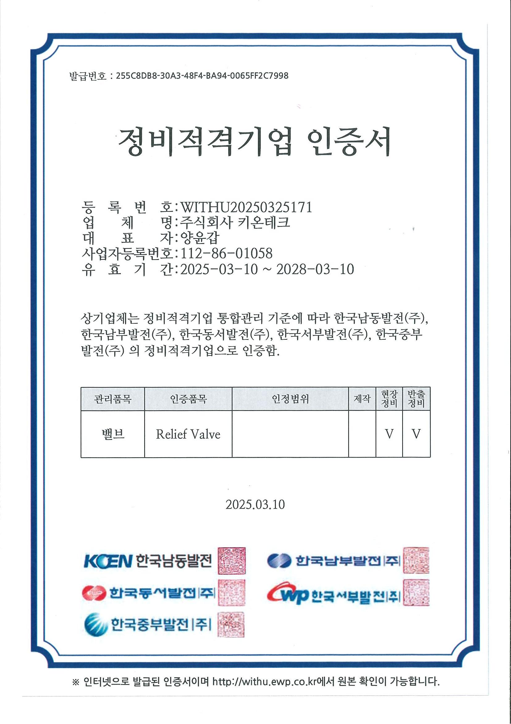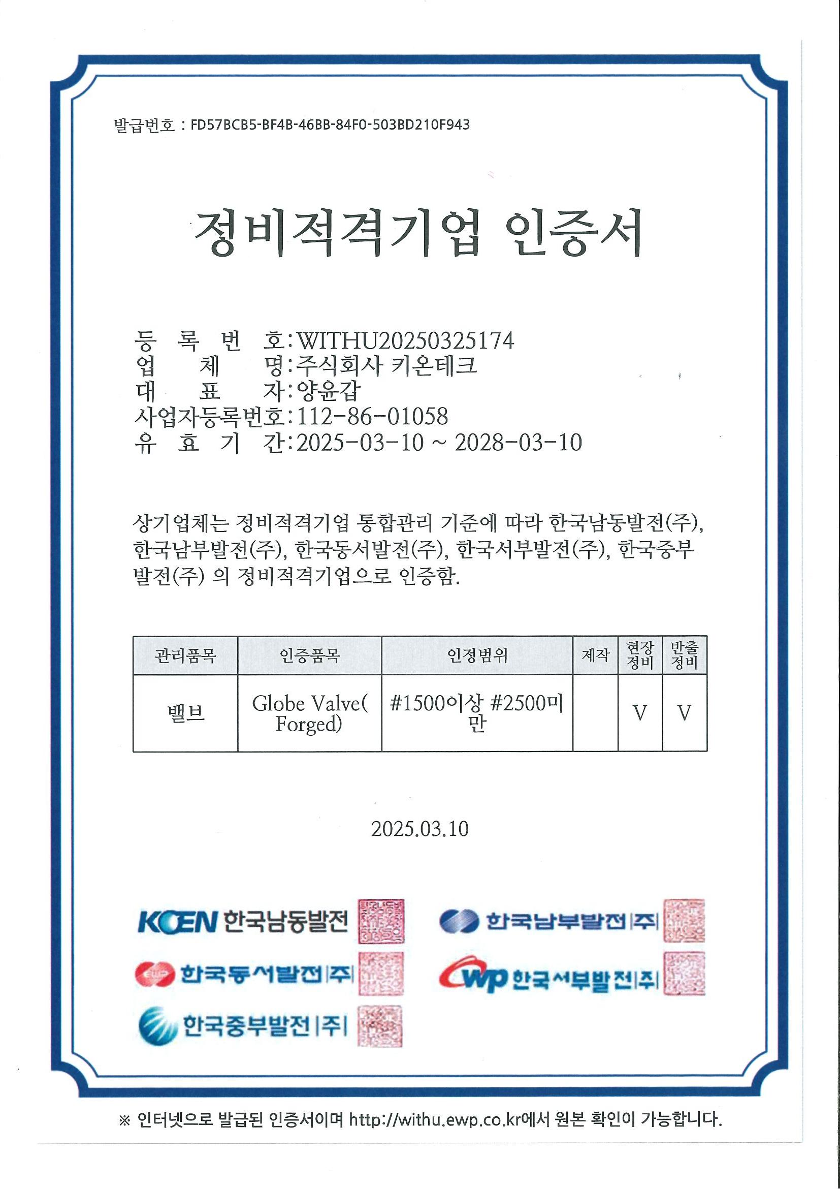 한전KPS경인 협력업체등록증,한국전력 정비적격기업 인증서 by ㈜키온테크 2024. 4. 12. ★한전KPS경인 지역협력업체등록증★ [안전밸브 현장정비 및 반출정비 적격 인증서] [게이트밸브 현장정비 및 반출정비 적격 인증서] [일반 원심펌프 현장및 반출정비 적격 인증서] [Relief Valve 현장및 반출정비 적격 인증서] [Glove Valve (cast)현장정비 및 반출정비 적격 인증서] Glove Valve(forged) 현장정비 및 반출정비 적격 인증서 공유하기 게시글 관리 ㈜키온테크 ☎ 031-848-9877 저작자표시 (새창열림)