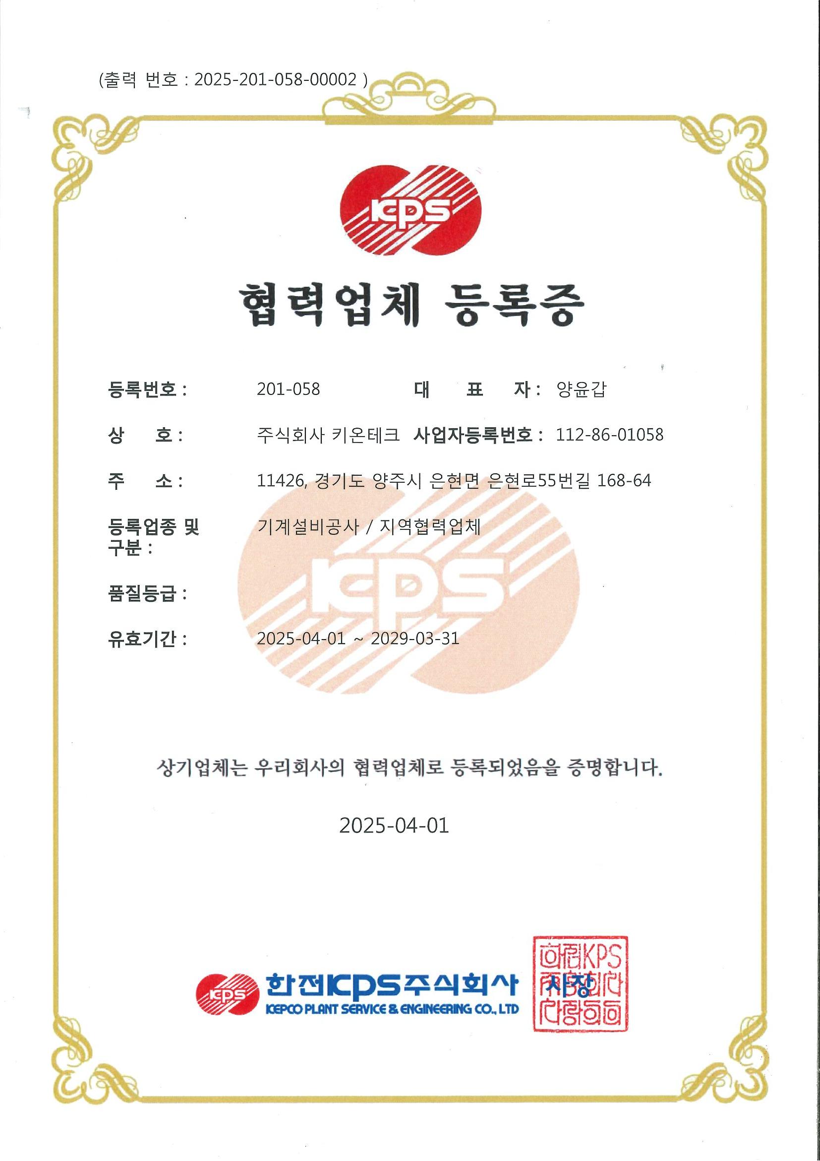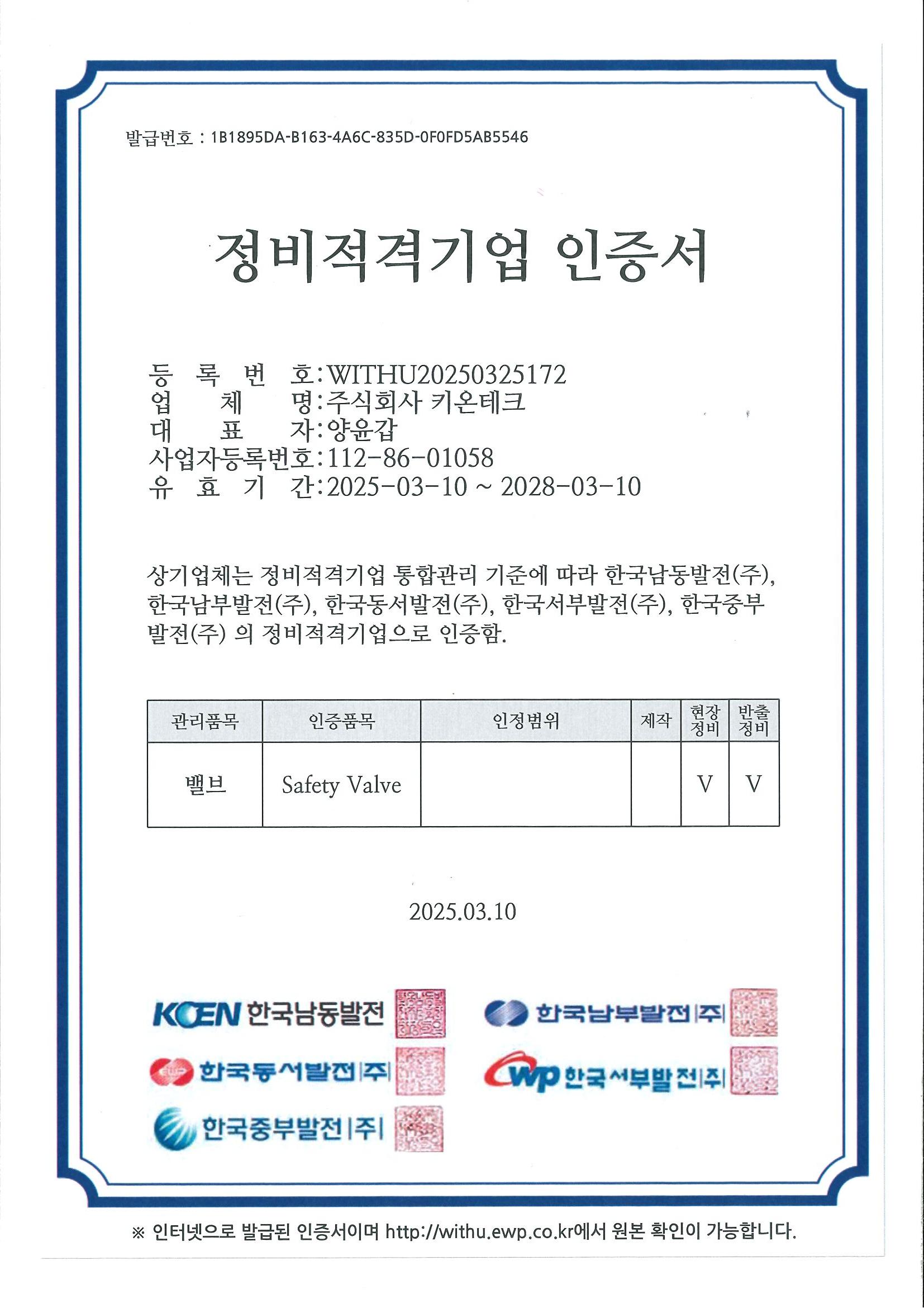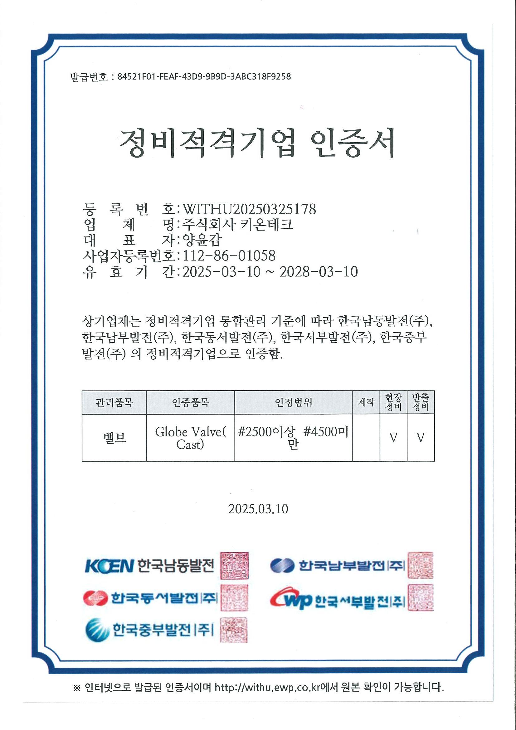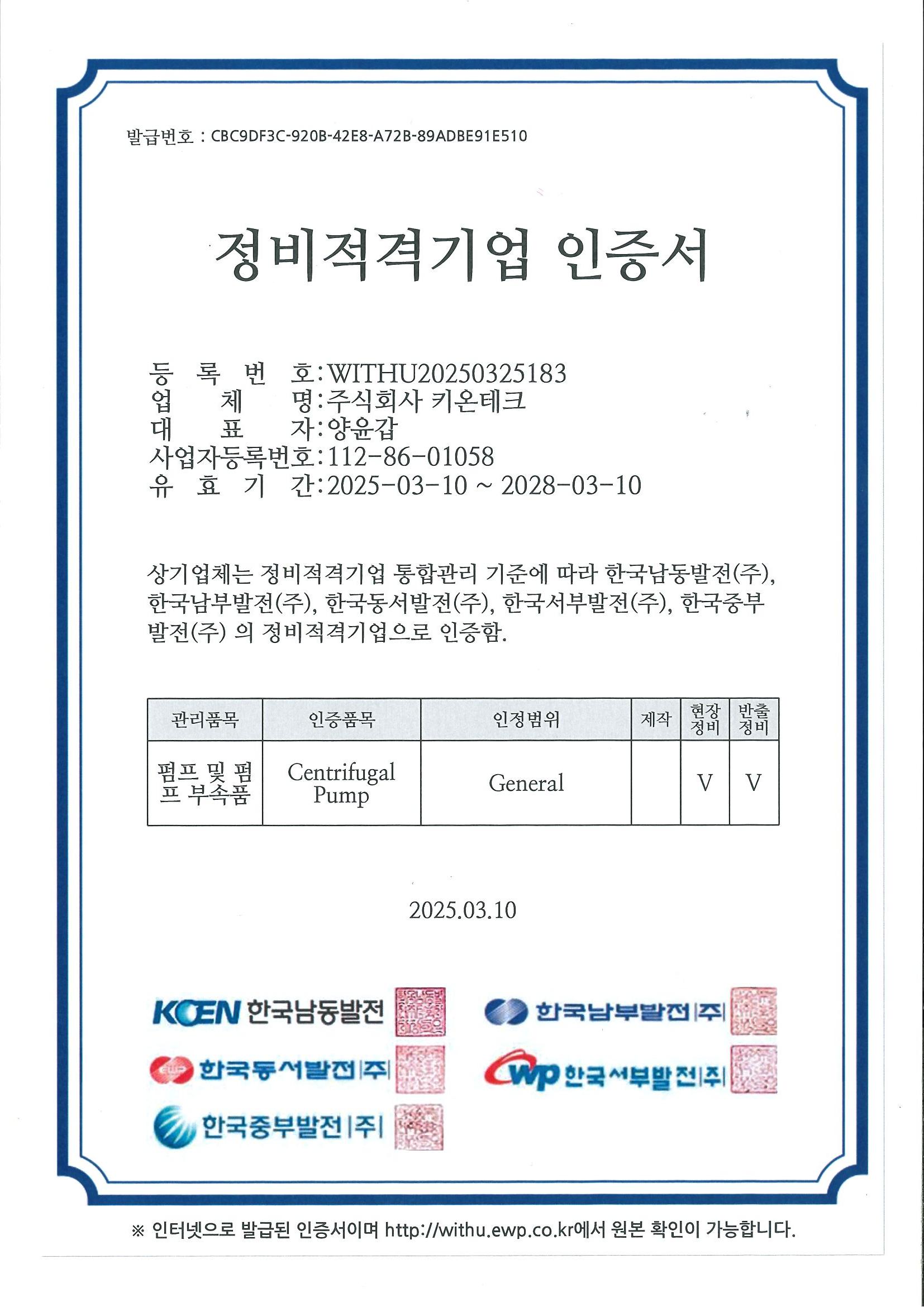 한전KPS경인 협력업체등록증,한국전력 정비적격기업 인증서 by ㈜키온테크 2024. 4. 12. ★한전KPS경인 지역협력업체등록증★ [안전밸브 현장정비 및 반출정비 적격 인증서] [게이트밸브 현장정비 및 반출정비 적격 인증서] [일반 원심펌프 현장및 반출정비 적격 인증서] [Relief Valve 현장및 반출정비 적격 인증서] [Glove Valve (cast)현장정비 및 반출정비 적격 인증서] Glove Valve(forged) 현장정비 및 반출정비 적격 인증서 공유하기 게시글 관리 ㈜키온테크 ☎ 031-848-9877 저작자표시 (새창열림)